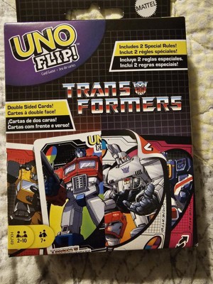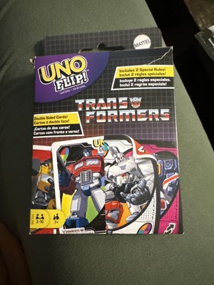 [This review was collected as part of a promotion.] We loved this version of Uno! We had the original, but not the Flip. And we enjoy Transformers also. This game has quickly made it into our card game nights on a regular basis. My kids love playing it, both too see the various Transformers as well as flipping the deck. Getting to play draw 5 on someone is one of their favorite things to do and it sends them into giggles every time. There are SO many Transformers used, that we are still trying to figure out the names for a few of them.