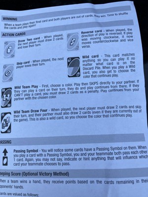 [This review was collected as part of a promotion.] So basically this is a standard uno deck but with some new rules. In order to play you should be either 4,6 or 8 persons to start.You need a teammate that sits on your opposite. The colored cards are basically the same as the regular uno except there are 'passing symbol and +2 on the teams cards so if you have to pass your teammate also and/or take de +2 you and your teammate. There is no wild+4 in this version of uno. It was fun to play with my kids, they had a lot of fun also is not hard to get the hang out of it.