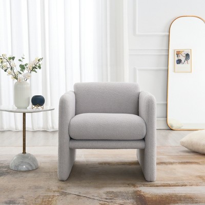 The barrel-inspired cutout back adds a touch of elegance and visual interest. Elevate your home with this modern and chic piece. Sleek curved arms round out the look, while the web suspension seat and foam-filled cushions provide just-right support making for an inviting seat that knows how to make a statement. Fully upholstered accent chair that requires no assembly. Please note that fabric and wood colors may appear slightly different due to variations in lighting or screen settings.