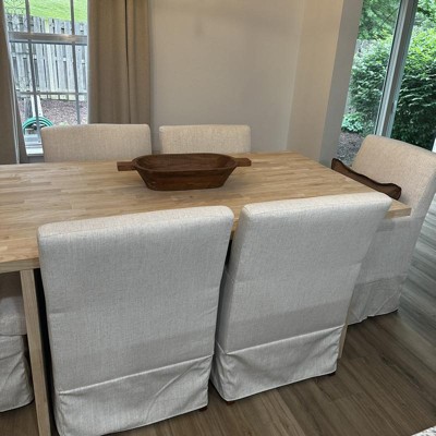 Chairs are way too short for a dining table. We bought leg extenders and they help a little. Also the “slipcover” doesn’t come off - only on the seat cushion. So after 2 years of regular use they are pretty stained and even our steam cleaner leaves water marks on this fabric. Wish we never bought!!