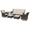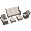 Are you looking for a comfortable sofa set for your family If so, this 6-piece patio sofa set is highly recommended to you. This set includes a 3-seat sofa, 2 ottomans, 2 swivel rocker chairs and 1 coffee table. ottoman can not only be used to relax your legs but also can be used as a small table or small stool, base of the swivel rocker chair is a dual-function disc base that can rotate 360° and also glide back and forth. Sturdy steel frames provide superior construction, seamless finish and convenience. 3.5 in. upgraded high-density and high-resilience sponge cushions provide more comfort and support. Add some pizzazz to your outdoor area with this complete set, designed with ultimate comfort and a modern appeal.