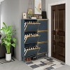This versatile cabinet combines durability, style, and functionality to meet the needs of any family space. It features a sturdy construction capable of supporting up to 220 pounds, providing dependable storage for shoes or other household items. The top surface is crafted from a PB sheet with a washed oak grain finish, offering both scratch resistance and waterproof protection to ensure lasting durability. The cabinet body boasts a rattan-textured iron plate with a machine-punched, evenly colored blue-gray finish that subtly shifts with changing light, adding a touch of modern elegance to your home. Its matte textured metal base offers versatile placement options—either wall-mounted using two metal feet for space-saving or freestanding on four feet for maximum stability. Thoughtfully designed for family use, it includes double the storage space for shoes, protective foot pads to prevent floor scratches, and secure wall mounting for enhanced safety, making it a practical and stylish addition to any household.