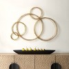The Golden Bubbles Metal Wall Decor captivates with its intricate spiral rings, reminiscent of glistening bubbles frozen in motion. Each piece is skillfully handcrafted from petite iron rods, interwoven to form a harmonious and elegant design. Finished in a rich antique gold leaf, it exudes sophistication and adds a warm metallic sheen to any wall. This versatile wall art can be hung in multiple orientations, making it a perfect statement piece for living rooms, entryways, or hallways.
