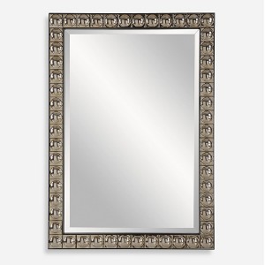 The Silvio Tiled Vanity Mirror offers a refined blend of craftsmanship and elegance with its repeated ceramic tiles, each featuring a convexed center finished in an antiqued silver-champagne plating. The mirror is framed by a sleek black iron inner and outer border, creating a striking contrast that enhances its luxurious appeal. A generous 1 1/4" bevel adds depth and dimension, making this mirror an exquisite focal point for any vanity, hallway, or living space.