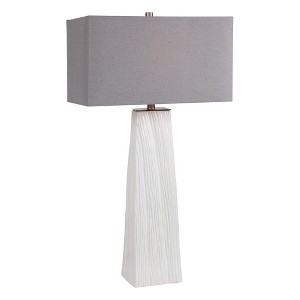 The Sycamore White Table Lamp brings a refined balance of elegance and modern organic charm. Crafted with a glossy white ceramic base adorned with subtle hand-carved details, the piece radiates understated sophistication. Brushed nickel accents add a contemporary touch, enhancing the clean lines and tactile surface.