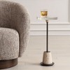 The Uttermost Arthur Crystal Drink Table blends luxury materials with modern design. Featuring a steel frame, crystal accents, and a marble top, this table adds elegance and functionality to any living space. Its polished bronze finish and compact form make it ideal as a drink table or accent piece.