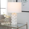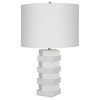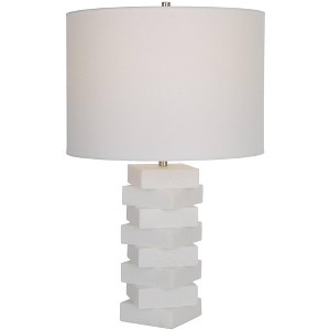 Whimsical geometric blocks arrange symmetrically to create a textural impact to this modern rustic stone accent table lamp. From the Ascent collection by Uttermost, this lamp appeals to both formal and casual design schemes, made versatile with a man-made ivory stone constructed body. Finish details include plated brushed nickel iron in a stem and finial, as a white hardback drum shade extends the airy ambiance of a stylish lamp.