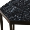 Honed black marble top with natural white veining. Satin black finish chiseled iron base.