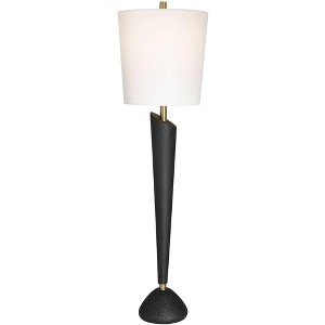 Organic texture and sharp contrast give this slim lamp an artful appeal. From the Cypher collection by Uttermost, its stone base features a deep pitted surface and antique brass plating. A white linen drum shade lends balance to its bold materiality.
