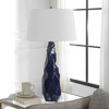 Introduce color and sophistication with the faceted design of a contemporary ceramic table lamp. From uttermost and the Kavos collection, this charming design features a tall, tapering base with gem-like character that infuses natural elegance. Its navy blue coloration is rich and deep, complementing in coastal and modern living spaces. A white linen hardback shade ensures diffused illumination and brushed brass finish details add a chic touch of warmth.