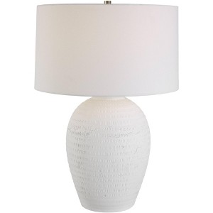 A striking ceramic table lamp features a timeless urn shape to bring traditional elegance to any tabletop. The lamp features a chalk white glaze with subtle distressing, accented with brushed nickel details. Its large round drum shade is made in a casual white fabric for crisp ambiance in any setting.