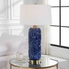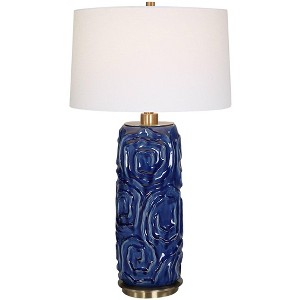 Bring fresh style to your decor with this ceramic lamp design. The lamp base features an artisan-crafted geometric pattern that's finished in a lightly distressed blue glaze. Antique brass finish accents provide additional visual interest and detail. Up top is a tapered drum shade in a white linen fabric with natural slubbing. Note that because the base is hand-crafted and has a fired glaze on ceramic lamps, color will vary slightly.