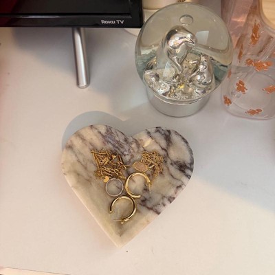 [This review was collected as part of a promotion.] This marble heart dish is beautiful and well-made. I’m using it as a jewelry dish, and it’s the perfect size for rings, earrings, and small every day pieces. The marble has a neutral elegant look so even though it’s heart shaped it works year-round and not just for Valentine’s Day. It’s a nice decorative touch to my dresser while still being functional. I would definitely recommend it for both the decor and every day use.