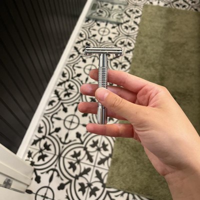 I always like these safety razors and wanted to try out this brand as the ones on Amazon tend to rust easily. I didn’t have any problems with rusting but I do keep it out of reach of running water and sitting upright. I didn’t have so much a problem with the blades I think they’re great. But so much with the design of the razor, it’s a cool concept with the twist open top to insert a new blade. I feel though as if the blade is so far back that it can’t grab any of the hairs you try to shave. I didn’t have any of that problem with the Amazon ones I was always able to get a nice clean shave. The only other problem I had to was the handle was so tiny and I’m a 5foot woman and it seemed to miniature for my hands idk how this is a men’s razor.