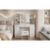 Feature:This modern makeup vanity with lighted mirror offers ample storage with 6 open shelves, 3 makeup trays, 5 large sliding drawers, and 1 side cabinet. The vanity desk features a big mirror with 10 LED bulbs in 3 lighting modes, complemented by an elegant design and a cushioned stool. Integrated with a charging station, this versatile vanity table with easy assembly is perfect for bedrooms, closets, and more, making it an ideal gift choice for anyone seeking style and functionality in their beauty routine.