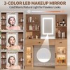 Transform your beauty routine with the ultimate 41-inch makeup vanity desk that combines spacious storage and modern convenience. Featuring two large drawers, four clear glass cabinets, and multiple open shelves, this elegant vanity keeps all your cosmetics, skincare products, and jewelry perfectly organized and within reach. The built-in power strip with two AC outlets and USB ports lets you style effortlessly using hair dryers, curling irons, or straighteners while charging your phone or beauty devices. Illuminate your look with the adjustable LED mirror offering multiple color temperature modes for flawless makeup application, skincare rituals, live streaming, or daily grooming.
