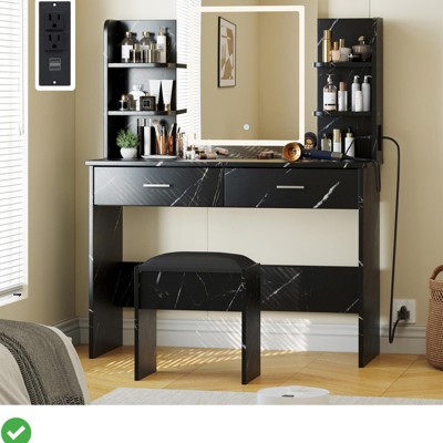 Vanity Desk with Mirror and LED Lights, Makeup Vanity Desk with Sliding Lighted Mirror, Power Outlet, Dressing Table with 4 Drawers, Storage Shelves & Cushioned Stool for Bedroom,Marble-Black & White, Natural/Marble-White/Black/White.