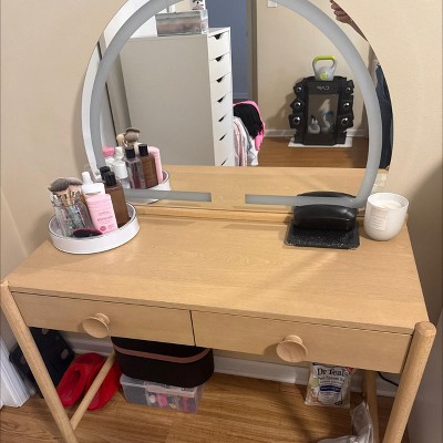 A: The vanity features two pull-out drawers for organizing makeup, jewelry, and other essentials.