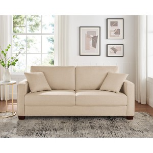 Simple, stylish, and built for everyday comfort—this upholstered couch brings a fresh yet timeless touch to any space. Wrapped in soft, muted fabric and generously padded with high-density foam, this modern sofa offers both structure and softness. The wide seat and plush back cushions make it ideal for reading, lounging, or catching up with friends. Two matching toss pillows are included, adding extra comfort and a finished look. Whether placed in a reading nook, home office, or guest space, this piece adapts easily to your lifestyle and decor.