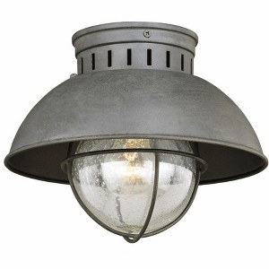 Collection: Harwich, Material: Steel, Finish Color: Textured Gray, Width: 9.25", Height: 5.5", Depth: 5.5", Hanging Method: Flush, Lamping Type: Incandescent, Number Of Bulbs: 1, Wattage: 60 Watts, Dimmable: Yes, Moisture Rating: Damp Rated, Desc: The Harwich flush mount barn light features a textured black finish with clear seeded glass shade. Its iconic nautical-style is at home in a cottage, country or coastal setting and is exactly what is needed to add style and distinction to any entryway, porch or patio area. Assembly Required: Yes / Back Plate Height: 5.12 / Back Plate Width: 5.12 / Bulb Shape: A19 / Dimmable: Yes / Shade Included: Yes. ,