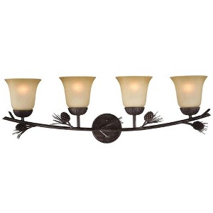 Collection: Sierra, Material: Steel, Finish Color: Black Walnut, Width: 56", Height: 18", Depth: 56", Backplate Width: 5", Backplate Length: 5", Lamping Type: Incandescent, Number Of Bulbs: 4, Wattage: 60 Watts, Dimmable: Yes, Moisture Rating: Damp Rated, Desc: The Sierra collection combines rustic and classic styling that brings nature indoors. This fixture features black walnut finish and frosted scavo glass, with twisted wire rope and pine tree elements. It is a great choice for a vacation lodge, cabin or a suburban home and it will complement a variety of home decors. Versatile reversible mounting option lets you install this fixture up or down. Black walnut finish offers a distinctive look and quality steel construction Creme cognac glass provides bright illumination and a rustic feel Uses 4 x 60 watt E26 Medium base bulbs (not included); LED compatible 33-in W x 11.5-in H x 8-in D Reversible mounting; can be installed up or down Mounting hardware and instruction manual inc