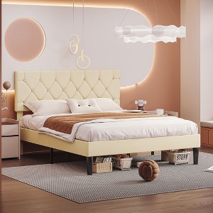 VECELO Full Upholstered Platform Bed Frame with Button Tufted Headboard, Wooden Slat Support, No Box Spring Needed, Linen Fabric, Beige