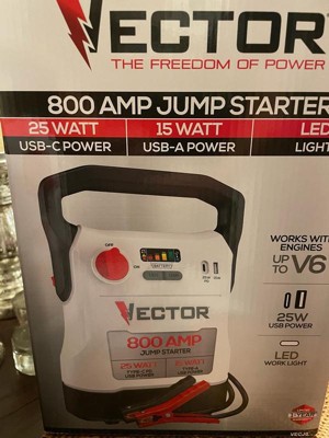 You can rely on the rechargeable Vector® VECJ8 800-Amp Compact Jump Starter to help start most cars or trucks up to V6 engines without the need for another vehicle. When you need to get charged up or run your devices, this unit features both 25-watt USB-C® PD and 15-watt USB-A ports. The powerful LED light is helpful for roadside repairs after dark._