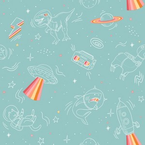 Blast off into a world of imagination with our whimsical Space Adventure wallpaper! Featuring a fun mix of intergalactic elements—from dinosaurs in space helmets and rocket-flying llamas to UFOs beaming rainbow rays and astronauts exploring the cosmos—this vibrant design is perfect for sparking creativity and wonder. The playful illustrations will captivate both kids and adults alike. Ideal for children’s rooms, play areas, or any space that needs a touch of cosmic fun, this wallpaper turns your walls into an exciting universe, ready to inspire endless adventures. Printed on a premium "seam-free" non-woven material that is totally PVC-free. Washable surface for easy maintenancePrinted with water-based inks Easy paste-the-wall application for perfect side-to-side match and seamless results Dry-removable in full strips for instant removal Requires medium to strong wallpaper paste