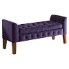 This elegant storage settee features all over button tufting for a luxurious look and feel. Upholstered in a soft and durable premium velvet fabric, this decorative bench has wood legs in a range of rich finishes. The hinged seat opens to reveal storage suitable for spare throws or pillows, books, magazines or toys. Use it as an end of bed bench, as an entryway bench or as extra seating and storage in a living room. This velvet bench is available in many rich colors and is part of a broader collection including accent chairs, tufted storage ottomans to match in the same great velvet fabric. Easy to assemble and maintain. Please note that fabric and wood colors may appear slightly different due to variations in lighting or screen settings.