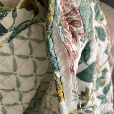 Low quality product! Bad stitching at seams, plus, fabric coming apart after first wash. Design/colors on quilt are unattractive. Design is not subtle, making it pop out too much from the white background. Additionally, yellow tone throughout the quilt’s flowers/stems is unpleasant to look at.
