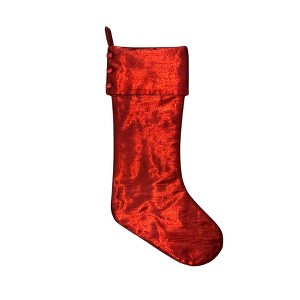 Vickerman Metallic Christmas Stocking. Crafted from polyester with a gleaming metallic sheen. Measuring 8 inches in width and 19 inches in height, it's the perfect size to hold your holiday surprises. This stocking comes with a loop for easy hanging and a