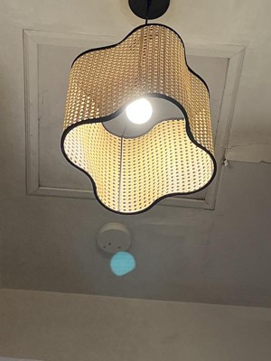[This review was collected as part of a promotion.] Such a unique light ! we love how it looks in our living room. The rattan and black velvet are a great combination, I was rather easy to install since it lightweight, It is a great size for any room and will go in a lot of different decor styles!