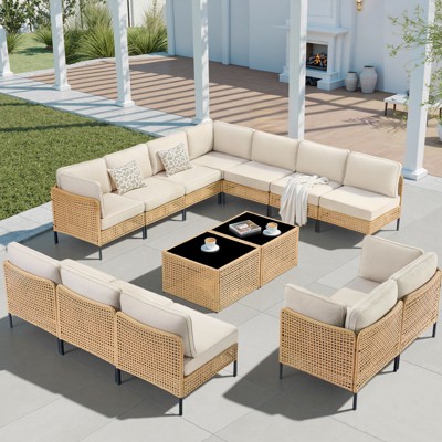 This 12-piece modular garden lounge set is here to elevate your outdoor relaxation with its smart design, creating a roomy and welcoming space for get-togethers. Each piece is made from PE rattan and powder-coated steel, giving it a sleek look that transforms patios, balconies, or gardens into fancy lounge areas, perfect for soaking up the sun or enjoying drinks in the evening.