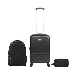 Embark on your travels with this versatile Viggio 3-piece luggage set, featuring a sleek black retractable trolley rolling suitcase, a convenient backpack, and a compact cosmetic case. Crafted from durable ABS and PC film materials, each piece is designed for easy maintenance with a simple wipe-clean surface. The rolling suitcase measures 20" H x 13.5" W x 8" D, the backpack measures 17" H x 12" W x 6" D, and the cosmetic case measures 4.5" H x 4.5" W x 8" D, providing ample storage for your essentials. Ideal for both business trips and leisure getaways, this set ensures style and functionality wherever you go.