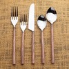 Look to the Vinear flatware set to elevate your dining experience. The organic round handles feature linear grooves, enhancing visual interest and grip. High-shine, hand-polished smooth utensils are the perfect contrast. This versatile artisan flatware makes a unique statement for casual or formal gatherings.