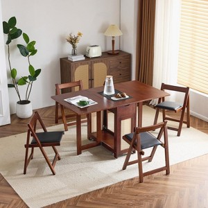 VINGLI 5-Piece Folding Dining Table Set, Extendable Drop Leaf Solid Wood Table with 4 Chairs, Drawers & Wheels