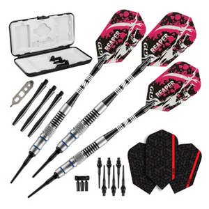 Your opponents will sense a feeling of dread wash over them when you come to shoot with the Viper Grim Reaper Soft Tip Darts, designed for use with either electronic dart boards or most sisal dart boards. These darts are packed with features starting with the barrel, fashioned from 80% Tungsten and 20% Nickel. Tungsten is a very dense metal, able to create slimmer darts with the same weight as lighter metals; this allows for tighter shot groupings without sacrificing control, increasing your scores. Tungsten is a sign of quality and durability as well because of its density. A higher tungsten content will produce a slimmer dart profile than one with less. More tungsten in the dart increases the price as tungsten is a rare metal and its density takes more effort to machine. The increased price gives a higher quality barrel and can improve performance, increasing scores. Each barrel enjoys knurled bands, deep grooves and hand painted rings, allowing your grip to remain consistent throw after throw. The Grim Reaper Darts feature tough, lightweight Aluminum Shafts, with diamond cut etchings for a fierce look. These shafts feature locking holes that allow a more secure fit to your barrel; you wont find yourself retightening these shafts after a shot or two. Finally, each dart is finished off with the spectre of death himself adorning each slim flight, for a terrifying look. Each set includes six high speed slim flights, three extra nylon shafts, nine 2BA Tufflex II Tips, dart mechanic repair tool, three flight protectors and a Deluxe Dart Pal Case. The Deluxe Dart Pal Case is a great all-in-one solution for your new darts. Featuring a hard outer shell and cloth lined slots to keep your dart secure, the Deluxe Dart Pal has room for everything included in this set!