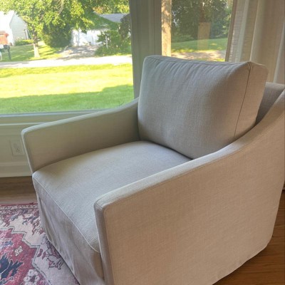 Give your living space a polished look when you add the Vivian Park Upholstered Swivel Chair from Threshold™ designed with Studio McGee. With its padded back, seat and armrests, this upholstered chair swivels for comfort and convenience. The frame is kept hidden by a slipcover that extends to the floor for a clean, polished look. Plus, it comes in a simple cream color that's easy to coordinate, looking just as good complementing furniture in other neutral hues as contrasting brighter, bolder colors.