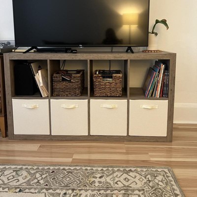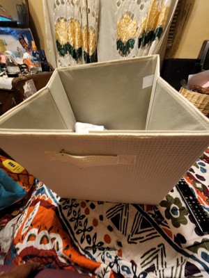 This is a cute and fairly sturdy storage cube; it's the standard size to fit most square bookcases/shelving. The fabric is a pale grey waffle-weave that's a great neutral, and it holds quite a lot of stuff (mine is holding extra towels). It comes flat and has to be expanded and the bottom put in place, but is also easy to fold back up if needed. My only issue was that the handles feel like they might not be super sturdy, so I'd suggest using it for lighter items like toys, blankets, towels, etc. rather than heavier items.
