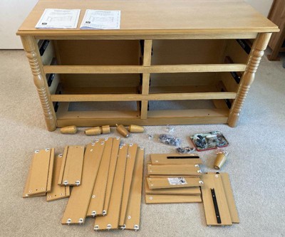 We are admittedly not super handy people. This took 1.5 hours for us to put together but was still much easier to assemble than a traditional dresser. I was very happy with the quality of the wood for the price. I had looked high and low for a vintage inspired dresser at an affordable price point. This looks beautiful in person. The drawers do stick a bit and you have to push them in with a little extra oomph. This is for a guest room space so that's no issue for us.