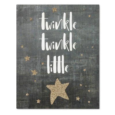 Let baby fall asleep to their favorite lullaby even when you aren't singing it with the Unframed Wall Canvas Twinkle Twinkle from Cloud Island™. The stars come down to earth with the words "twinkle twinkle little" popping on a canvas the color of the night sky, while a golden star finishes the classic bedtime song. Smaller golden stars glitter and twinkle in the background, giving a dreamy quality to your nursery decor. Add starry accents throughout your nursery with the reversible Mountains Good Morning/Good Night throw pillow and Good Night Light Box from Cloud Island™.