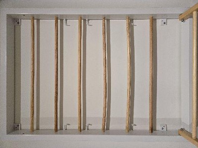 Basic wall mounted drying rack. The support arm is a little loose, so we have to be aware when opening or closing, but it does the job and is aesthetically pleasing