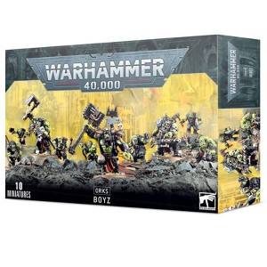 This kit builds five Ork Boyz equipped with a slugga and choppa, three with shootaz, one with a special weapon, and one Boss Nob to lead them. Special weapon options for one ork give you a choice of more dakka with a big shoota or big booms with a rokkit launcha, while the Boss Nob comes with helmeted or unhelmeted options and a choice between a nasty power klaw or a big choppa.