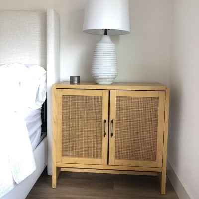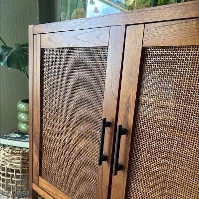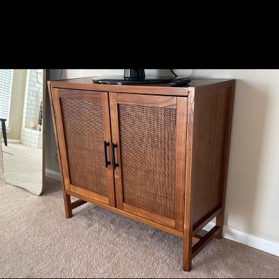 Love the piece. Have 2 together under the tv in our den for lots of storage. Bought 1 originally on sale last year for our entryway and then decided to use it for this instead, so ordered another. Did have to exchange it because the rattan on the one we bought was damaged, but the others were totally fine. The rattan does feel like it could get damaged pretty easily. The color matches our nutmeg maple Ethan Allen furniture perfectly if that helps anyone get a realistic color expectation. It is a little red toned, but that’s exactly what we were looking for. There is a gap between the doors too I wish could be just a little smaller. That and the delicate rattan are really the only reason for subtracting a star. It does feel substantial, but I don’t know that they are worth $250.