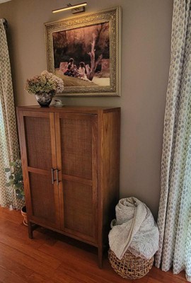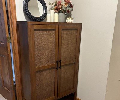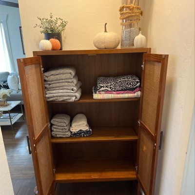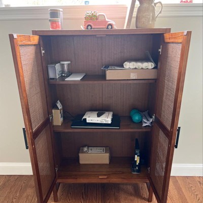 I bought this to replace an IKEA cabinet in my dining room & it is as beautiful as I’d hoped! Beware that the assembly directions are pretty awful- many steps are not listed, so you need to think it through beforehand to ensure you don’t screw things together before putting the next piece in place, or without threading on the washers first. It was very annoying to have to re-do steps simply because they didn’t include 1 sentence in the directions. That being said, the doors went on well & were easy to readjust via the hinge screws so they lined up perfectly- this is usually the most frustrating step in assembling cabinets with doors. Also, the 2 shelves just sit on top of the shelf supports & could be easily moved or lifted up. I store lots of kitchen appliances in here, so I wanted them to be fixed. I just screwed in an L-bracket on the sides of each shelf to make them way more stable. I didn’t love the see-through aspect of the woven doors which made it look very dark, so I taped pieces of watercolor paper to the inside to lighten it up & to completely hide what is inside. I did have to do a bit of extra work to get the look & function I wanted, but I’m super happy with the final result. It is a really pretty cabinet & a huge upgrade to my space!