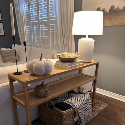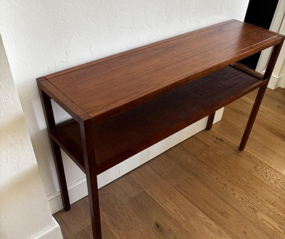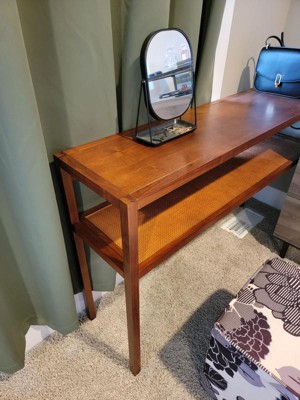 This is a nice console for the price. It does the job but it looks cheap close up. My husband easily put it together. The cane shelf is a little hard to clean because of the texture.