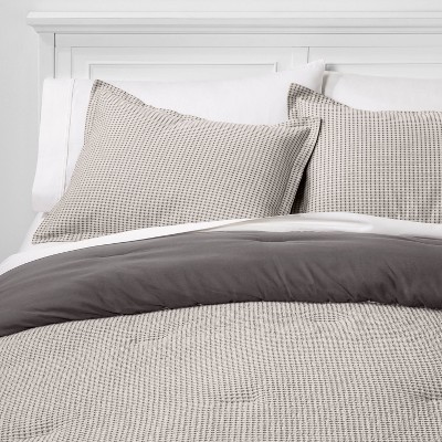 Cozy up your bed space in comfy, classic style with this Washed Waffle Weave Bedding Collection from Threshold™. This elegant bedding collection showcases a comforter set and a duvet set, complete with matching shams, in a washed waffle weave design that adds texture to your bedroom space while fitting in perfectly with the rest of your decor. Defined by warm color tones and minimalist designs, this waffle weave bedroom collection exudes contemporary vibes while bringing maximum comfort to your private retreat.