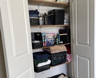This entire collection is perfect for my needs. Also, this basket in the collection is STACKABLE (see photos - there are slide-out tabs on the bottom. I did not realized this until my second order, not that I have the room to store them stacked!) I wanted to "hide" my items, but also be able to see them (yes, that's an oxymoron, but it works! The baskets hide enough to make my laundry and closet areas managed, but I can see through the little holes to know exactly what's in them. They also come in the perfect length/widths to place on standard shelving. I had ordered hang-on bin labels from Am*@z0n, but I do not think I'll need them.