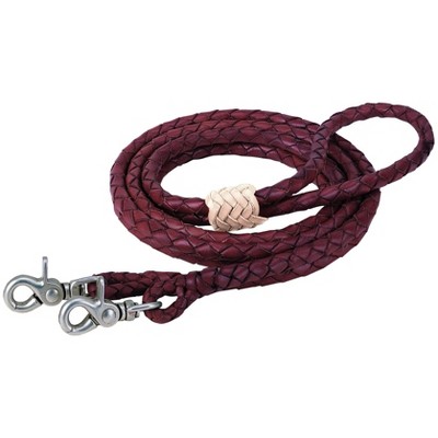 Weaver Leather Poly Roper Rein - Enhanced Grip & Control for Disciplined RidingExperience the perfect blend of durability and comfortable handling with the Weaver Leather Poly Roper Rein. Designed for riders who demand precision and confidence, this rein offers a superior feel that inspires control in every discipline, from cutting and reining to barrel racing and general western riding.Crafted from high-quality poly rope, these reins boast a beautifully broken-in, soft texture from the very first use. Say goodbye to stiff, abrasive reins and hello to a comfortable grip that reduces hand fatigue, allowing you to focus on your horse and your performance. Whether you're competing in reined cow horse events, navigating a challenging cutting pattern, or perfecting your barrel racing turns, the Poly Roper Rein provides the consistent feel you need.The meticulously attached golden brown leather water loop ends not only add a touch of classic western elegance but also ensure a secure and reliable connection. These ends are expertly attached with durable leather laces, offering a robust construction that stands up to the demands of serious equestrian sports. Each rein is fitted with strong, nickel-plated scissor snaps for quick and easy attachment and detachment to your horse's bridle, ensuring seamless transitions between rides.Measuring a versatile 5/8" in width and 10' in length, these reins are ideally suited for a variety of western disciplines, offering ample room for subtle rein aids and precise communication with your equine partner. Elevate your riding experience with reins that offer both performance and lasting quality.Key Features:Frequently Asked QuestionsWhat equestrian disciplines are these reins best suited for?The Weaver Leather Poly Roper Rein is exceptionally well-suited for a range of western disciplines including reining, cutting, reined cow horse, barrel racing, and general pleasure riding. Their comfortable grip and precise control make them a favorite among riders who value responsive communication with their horse.What is the material of the rein?The primary material of the rein is high-quality poly rope, chosen for its soft, broken-in feel and durability. The ends are finished with genuine golden brown leather.Are the scissor snaps durable?Yes, the reins feature nickel-plated scissor snaps, which are known for their strength and resistance to corrosion, ensuring reliable performance and longevity.What is the advantage of the "broken-in" feel?A broken-in feel means the reins are soft and pliable from the start, preventing the stiffness often associated with new reins. This offers immediate comfort, reduces the risk of blisters or hand fatigue, and allows for more subtle and effective rein aids.How do the leather water loop ends contribute to the rein's functionality?The leather water loop ends are a traditional western rein feature that provides a clean, finished look and a secure point of attachment. They are typically designed to integrate seamlessly with the bit, offering a smooth connection for refined communication.What are the dimensions of the rein?These reins measure 5/8 inches in width and are 10 feet in length, providing a standard and versatile size for most western riding applications.```