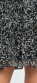 [This review was collected as part of a promotion.] This dress is SO cute! I love the ruffled layers! The cinched waist is very slimming too. It’s really a great and flattering fit for different body types. I am short (5’0”) and a medium it hits right above the knee and the sleeves are full-length on me. The simple black and white pairs well with the small pattern. This dress is great for day or night with a quick change of shoes and accessories.